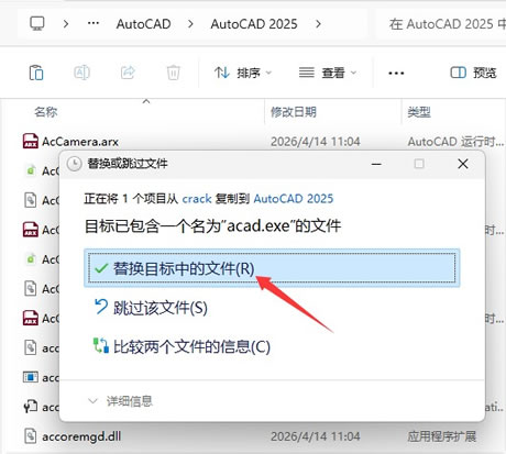 7)回到第一步解压的文件夹里,在 crack 里找到 acad.exe,将它复制到之前 AutoCAD 的安装目录里(我的是 D:\AutoCAD\AutoCAD 2025):