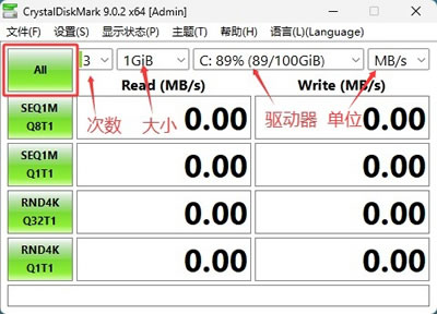 - 测试大小从16MiB到64GiB不等,默认是1GiB,对于低速存储设备(如U盘),建议选择较小的测试大小。