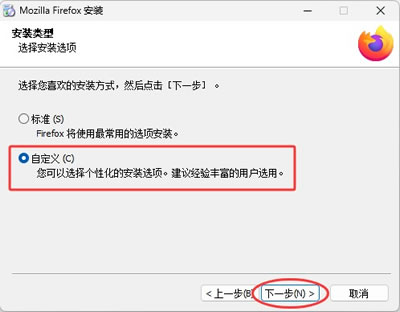 3)选择“自定义”,后续可以自定义 Firefox 的安装路径: