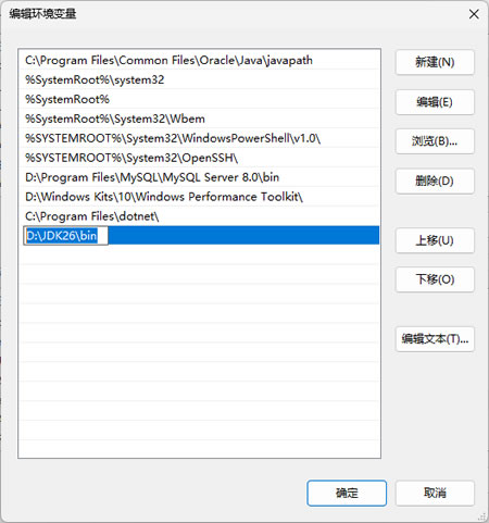5)点击"新建",添加 JDK 的 bin 目录路径,我的是"D:\JDK26\bin":
