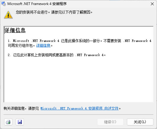 安装程序会自动下载和安装所需组件,安装完成后可能需要重启计算机。如果你的电脑已经安装了 .NET 4.0 或者更高版本,那么会弹出下图界面,提示无需安装,因为高版本向后兼容 4.0 版本: