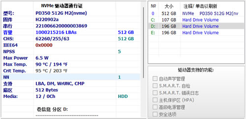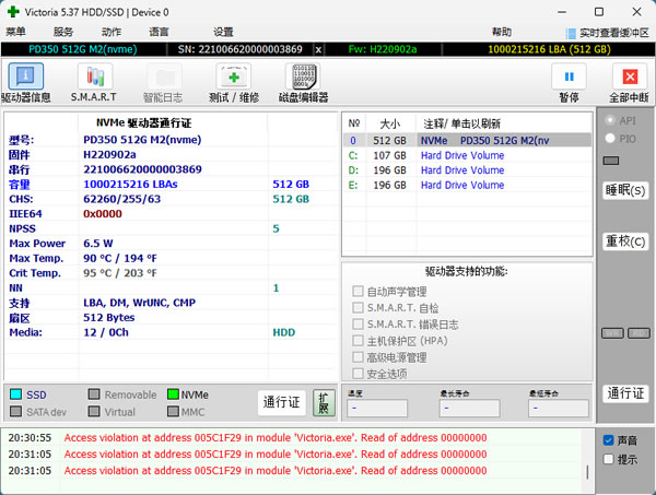 对于NVMe固态硬盘,Victoria 5.37版本新增了专门的支持。在"NVMe"选项卡里,你可以查看NVMe硬盘的详细信息,包括温度、健康状态、剩余寿命等。
