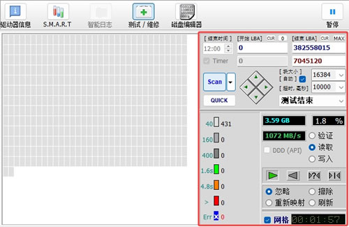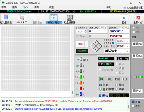 除了基础检测,Victoria还有一些高级功能值得一试。在"测试"选项卡里,选择"读取"模式,然后点击"Scan开始",Victoria会对硬盘进行全面扫描。