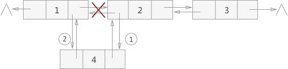 在双向链表中插入数据时,首先完成图 3 中标注为 1 的两步操作,然后完成标注为 2 的两步操作;反之,如果先完成 2,就无法通过头指针访问结点 2,需要额外增设指针,虽然能实现,但较前一种麻烦。