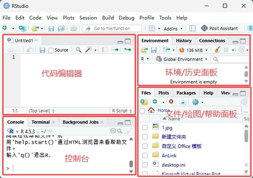 位于左下角,这是运行R代码的地方。你可以在控制台中直接输入R命令并执行,也可以运行编辑器中的代码。控制台会显示代码的运行结果和输出信息。3) 环境/历史面板