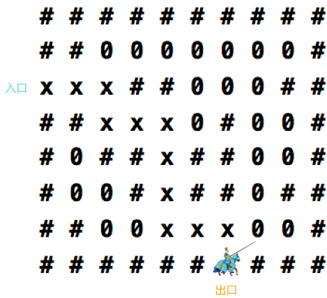 当骑士处于入口的位置时,他会前后左右的进行探索式前进,当他发现前方道路可行时,即坐标为(2,1)的通路,此时骑士会快速移动至该位置,进行以该位置为中心的再次探索式前进。提示:迷宫中,‘0’ 表示道路,‘#’ 表示障碍。